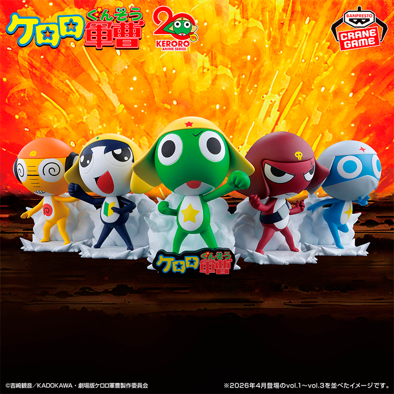 Esta figura es de la serie «Invadiendo Pekopon» y se compone de 5 figuras: Keroro, Giroro, Tamama, Kururu y Dororo.